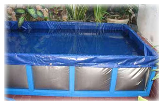 Kolam yang telah dibuat tadi kemudian dilapisi dengan terpal hingga luar kolam Sehingga ketika hujan datang budidaya udang air tawar di kolam terpal ini bisa terlindung dari longsoran tanah dari luar Karena longsoran tanah ini akan berakibat pada derajat keasaman air atau ph air